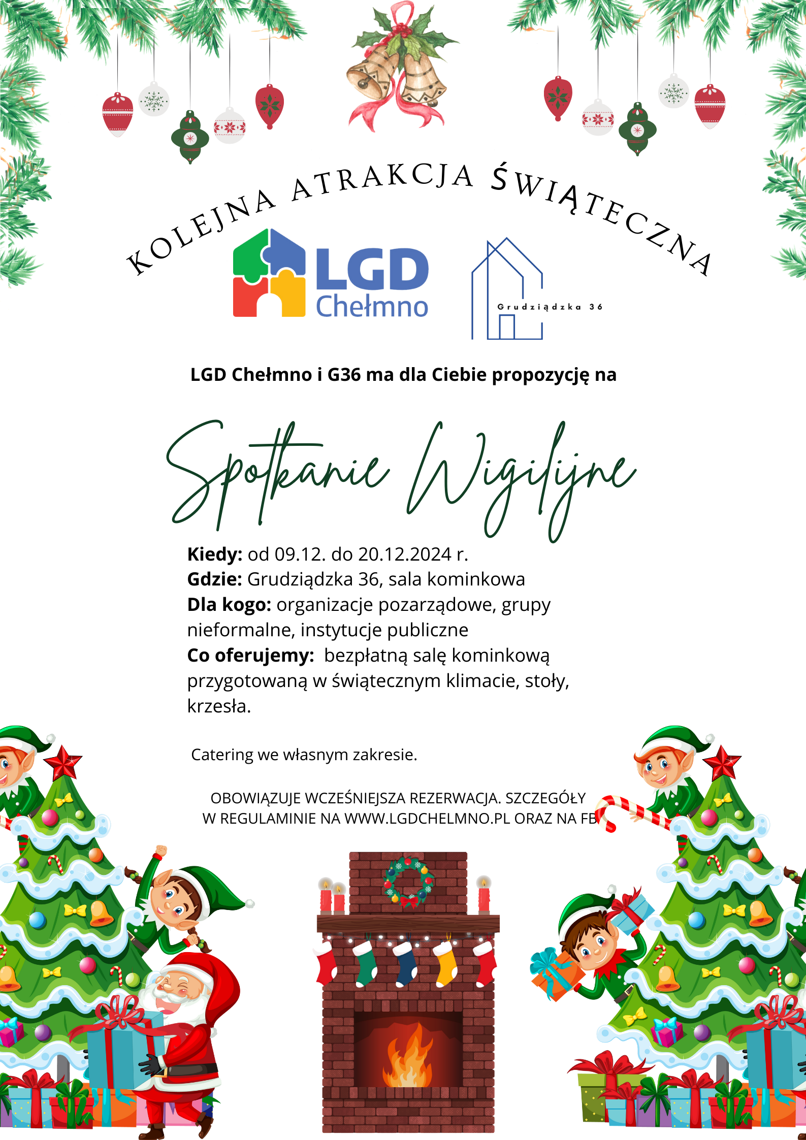 Oto kolejna atrakcja z okazji świąt proponowana przez LGD Chełmno i Grudziądzka 36. Tak jak rok temu przygotujemy dla Was wystrojoną salę kominkową na zorganizowanie spotkania wigilijnego. Oferta będzie dostępna w dniach 09.12.2024 - 20.12.2024, a zapewniamy Wam:
